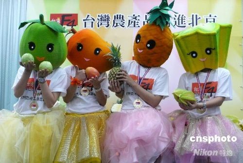 7月30日,臺灣“農委會”在臺北舉行“臺灣農產品前進北京”記者會,表示獲選奧運推薦水果的臺灣鳳梨(菠蘿)、楊桃、芭樂(番石榴)、芒果共計10噸,正由島內陸續運往北京專供奧運村。圖為記者會上,四名戴著水果頭套、裝扮成奧運水果運動員的女生展示這四種水果,代表臺灣水果“前進”北京奧運啟動。 中新社發 董會峰 攝