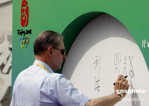 8月1日,北京奧運(yùn)村“和平友誼墻”正式啟動。國際奧委會主席羅格在和平友誼墻“簽名墻”上簽下自己的中文名字。 中新社發(fā) 杜洋 攝