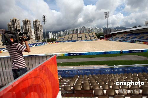 八月一日,香港奧運馬術公司在沙田賽場舉行記者會,讓記者在賽場內了解場館規則。首場奧運馬術賽將在八月九日上午六點三十分開賽。 中新社發 洪少葵 攝
