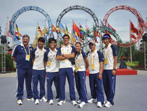 圖:香港單車隊與賽艇隊成員在奧運五環前合照(大公報攝)