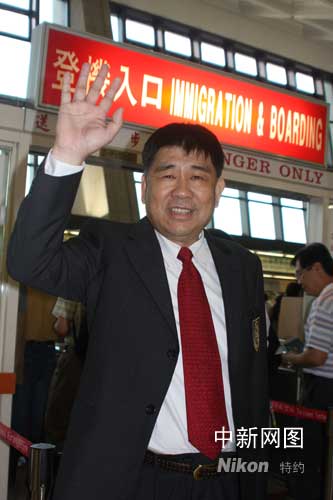 圖為蔡賜爵在桃園機場登機入口處揮手致意。(中新網記者 董會峰/攝)