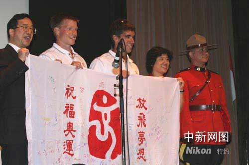 精彩的演出中,兩位陽光小伙——加拿大皮劃艇國家隊隊員,奧運選手希爾和莫蒂默的到來讓觀眾格外興奮。而對于主持人黃源博士精心準備的加試——“筷子夾乒乓球”,他們輕松過關,獲得了在場所有人簽名祝福的奧運五環旗這一特別禮物。他們也表示將會帶著大家的祝愿,盡最大努力實現目標。
