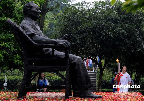 8月3日,奧運圣火在四川廣安傳遞,前女排國家隊運動員陳靜在小平紀念園的鄧小平銅像前傳遞火炬。 中新社發 廖攀 攝