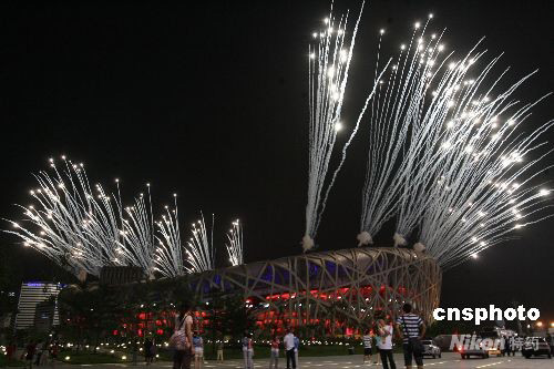 圖:奧運(yùn)會開幕式彩排 “鳥巢”上空煙花綻放