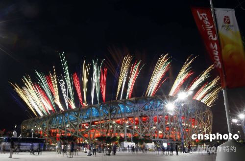 8月2日,北京奧運會開幕式彩排,“鳥巢”放焰火。 中新社發 杜洋 攝