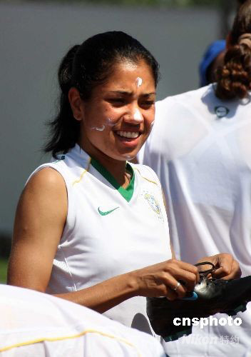 8月3日,巴西女足隊(duì)員在沈陽奧體中心訓(xùn)練場(chǎng)進(jìn)行訓(xùn)練,隊(duì)員練前涂抹防曬霜。當(dāng)日,沈陽氣溫為31攝氏度,天氣預(yù)報(bào)顯示未來72小時(shí)沈陽都將是32~22攝氏度、風(fēng)力小于3級(jí)的晴好天氣。中新社發(fā) 張宇 攝