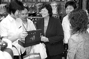 昨日,市場工作人員贈(zèng)送羅格夫人(中)一套《孫子兵法》竹簡。
