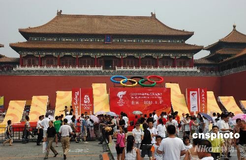 8月5日,北京故宮午門外廣場設立奧運會火炬傳遞起跑儀式大型舞臺。該舞臺縱深12米,寬42米,最高點達4.8米,由多幅奧運噴繪以及巨型五環等元素組成。舞臺四周將搭建玻璃鋼仿制的漢白玉欄桿,兩側甬道將設立記者席和觀眾席,預計可容納500名記者以及3000名左右觀眾。中新社發 張雙雙 攝