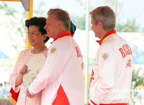 8月5日,俄羅斯奧運(yùn)代表團(tuán)在北京奧運(yùn)村舉行升旗儀式,北京奧運(yùn)村村長陳至立出席了升旗儀式。中新社發(fā) 盛佳鵬 攝