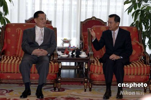 5日下午,中國國民黨榮譽主席連戰夫婦一行抵達北京首都機場,中共中央臺辦主任王毅到機場迎接。 中新社發 王東明 攝