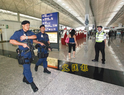 在香港國際機(jī)場可以看到,該處的保安已明顯加強(qiáng),在小范圍內(nèi)已有多名保安人員執(zhí)勤,而且每行登機(jī)柜位都最少有一名保安人員站崗。手持輕機(jī)槍的機(jī)場特警亦加強(qiáng)巡邏,留意有否發(fā)現(xiàn)可疑物品。有機(jī)場內(nèi)商戶指,從星期天起,機(jī)場內(nèi)保安人手已明顯增加,除擔(dān)任日常巡邏外,最近也多了保安人員在定點(diǎn)站崗。