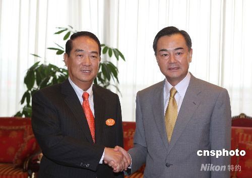 8月6日,中共中央臺辦主任王毅在北京首都國際機場歡迎應邀出席北京奧運會開幕式的親民黨主席宋楚瑜一行。 中新社發 廖文靜 攝