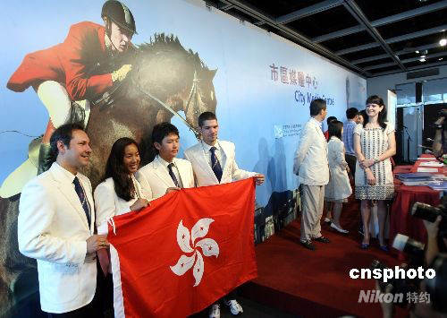 八月七日,出戰(zhàn)奧運(yùn)馬術(shù)比賽的香港隊(duì)成員(左起)教練韓啟仁、選手林子心、鄭文杰及林立信首次在媒體中心與記者見面。 中新社發(fā) 洪少葵 攝