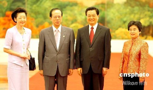 8月8日中午,中國國家主席胡錦濤和夫人劉永清在北京人民大會堂為出席北京奧運會貴賓舉行歡迎宴會。圖為胡錦濤夫婦歡迎日本首相福田康夫夫婦。中新社發 任海霞 攝