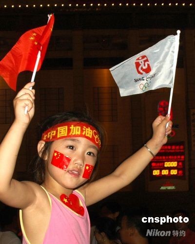 8月8日晚8時,北京天安門廣場東側奧運倒計時牌歸零。在天安門廣場為北京奧運狂歡的一位小女孩拿著中國國旗為北京奧運加油。中新社發(fā) 張雙雙 攝