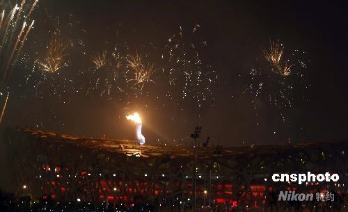 8月8日,第29屆夏季奧運會在北京奧林匹克公園內的國家體育場“鳥巢”舉行。李寧點燃北京奧運會主火炬,奧運圣火在鳥巢上空熊熊燃燒。中新社發 盛佳鵬 攝