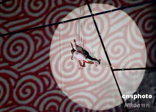 8月8日,第29屆夏季奧運會在北京奧林匹克公園內的國家體育場“鳥巢”舉行。中國“體操王子”李寧飛繞“鳥巢”一周后點燃主火炬。 中新社發 任晨鳴 攝