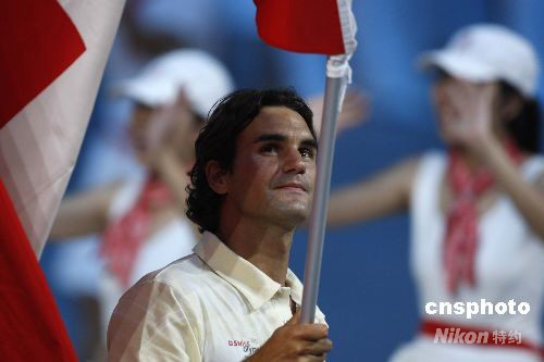 8月8日,第29屆夏季奧運(yùn)會(huì)在北京奧林匹克公園內(nèi)的國家體育場“鳥巢”開幕。各個(gè)奧運(yùn)代表團(tuán)的旗手都是該國的體育明星。圖為瑞士奧運(yùn)代表團(tuán)旗手“網(wǎng)球天王”費(fèi)德勒。 中新社發(fā) 杜洋 攝