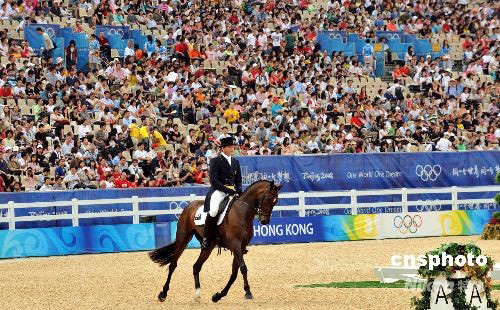 八月九日,北京奧運(yùn)馬術(shù)項(xiàng)目首日在香港沙田賽場(chǎng)舉行盛裝舞步賽事。此項(xiàng)比賽旨在考驗(yàn)馬匹的服從性、靈活性,騎手與馬匹須合作演出一連串精心設(shè)計(jì)的優(yōu)雅舞步動(dòng)作,因此,馬術(shù)盛裝舞步賽被稱為“馬術(shù)芭蕾”。 中新社發(fā) 鄧慶樂 攝