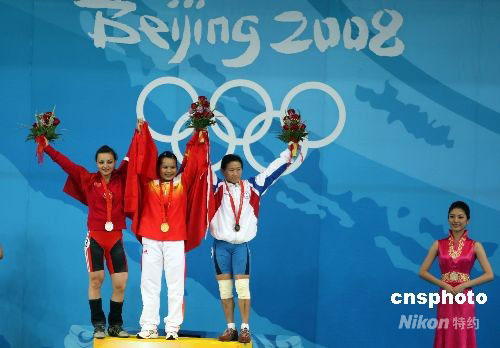8月9日上午,中國舉重選手陳燮霞在北京奧運會女子舉重48公斤級決賽中以總成績212公斤打破奧運會記錄,力壓各路群芳獲得冠軍,土耳其選手西貝爾·厄茲坎(OZKAN Sibel)獲得銀牌,中華臺北選手陳葦綾(右)獲得銅牌。中新社發 任晨鳴 攝