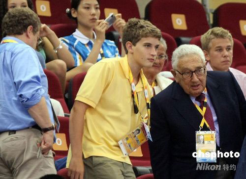 8月9日下午,中國女籃在北京奧運(yùn)會籃球館--五棵松體育館舉行的小組賽首場比賽中,以67比64險(xiǎn)勝擊敗西班牙隊(duì)。前來參加北京奧運(yùn)會開幕式的美國前國務(wù)卿基辛格,在家人陪伴下到場觀看。中新社發(fā) 任晨鳴 攝