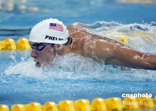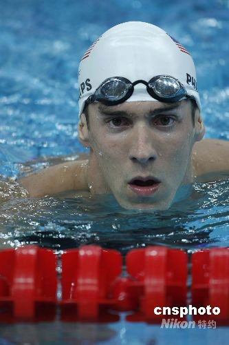 8月9日,北京奧運(yùn)會(huì)游泳大戰(zhàn)在國家游泳中心“水立方”揭開序幕。力爭(zhēng)在本屆大賽奪取8枚金牌的美國游泳名將菲爾普斯在當(dāng)日進(jìn)行的男子400米混合泳預(yù)賽中以4分07秒82的成績(jī)打破奧運(yùn)會(huì)紀(jì)錄,顯示了良好狀態(tài)。中新社發(fā) 杜洋 攝