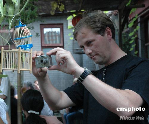圖為奧地利游客8月9日下午游覽北京胡同的四合院時(shí),對(duì)主人掛在院中竹籠里的蟈蟈蟲深感好奇。中新社發(fā) 王辛莉 攝
