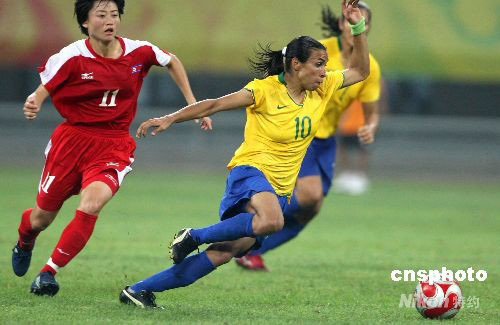 8月9日,北京奧運會沈陽分賽場舉行女足預賽,巴西隊最終以2:1勝朝鮮隊。巴西球星瑪塔打入第二粒進球。 中新社發 張宇 攝