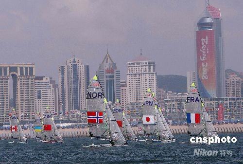 北京2008奧運帆船比賽8月10日繼續在青島舉行,各國的參賽帆船出發的場面成為一道風景線。 中新社發 趙振清 攝
