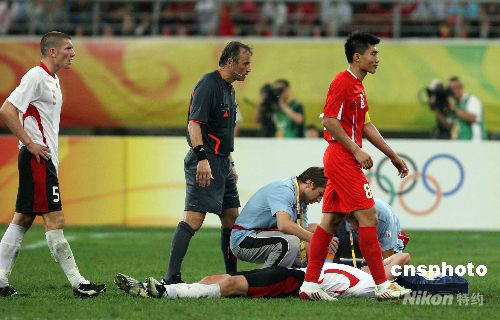 北京時間8月10日晚,奧運男足賽第二輪打響。中國國奧隊在沈陽迎戰比利時國奧隊。經過90分鐘的激戰,中國國奧隊0:2不敵對手,比賽中兩名中國國奧隊員吃到紅牌被罰下場。 中新社發 張宇 攝