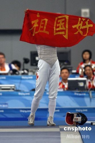 8月11日,北京奧運(yùn)會(huì)女子花劍個(gè)人1/32決賽在擊劍館進(jìn)行,加拿大選手欒菊杰13比9戰(zhàn)勝突尼斯選手伊娜·布貝克里。圖為欒菊杰獲勝后高舉“祖國好”。 中新社發(fā) 盛佳鵬 攝