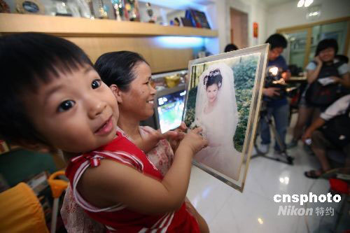 小佳慧剛滿四個月,冼東妹就離開女兒回到柔道訓練場。這次在電視上看見媽媽獲勝,小佳慧顯得很高興,緊緊地抱著媽媽的婚紗照準備給媽媽一個飛吻。中新社發(fā) 夏世焱 攝