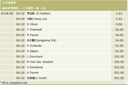 而從單項金牌博彩公司開出的賠率看來,中國軍團在乒乓球、羽毛球和跳水等傳統強勢項目上均位列第一。至于備受關注的男子110米欄,不同博彩公司就有了差異。如易勝博等仍將劉翔排在首位,賠率為1.8左右,但立博等博彩公司則更看好古巴小將羅伯斯,賠率為1.6左右,低于劉翔的2.6。