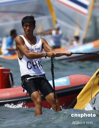 8月11日下午,奧帆賽尼爾級帆板開賽,在剛剛結束的男子帆板第二輪比賽中。中國選手王愛忱小組排名第八,前兩輪比賽總排名第三,凈得分10。 中新社發 周青先 攝