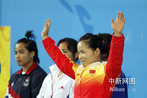 8月11日,北京奧運會開賽以來的第三天,女子舉重58公斤級的決賽在北京航空航天大學體育館拉開戰幕。雅典奧運會冠軍中國選手陳艷青獲得北京奧運會舉重女子58公斤級金牌,成功衛冕,為中國代表團贏得第八枚金牌。中新社記者 盛佳鵬 攝