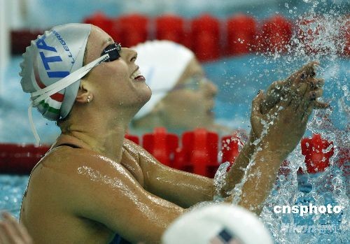 8月11日,在北京奧運會女子200米自由泳預賽中,意大利選手費代麗卡·佩萊格里尼以1分55秒45,破世界紀錄。中新社發 杜洋 攝