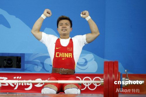 8月11日,北京奧運會開賽的第三天,男子舉重62公斤級的決賽在北京航空航天大學體育館拉開戰幕,中國選手張湘祥輕松摘得金牌。中新社發 盛佳鵬 攝