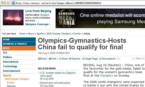 正當(dāng)中國觀眾慶賀中國體操女隊史無前例地以第一名的成績挺進(jìn)團體決賽的時候,地球另一邊的英國路透社卻依然沉浸在自己的黃粱美夢中。他們在比賽結(jié)束后居然發(fā)出新聞,稱中國女隊已經(jīng)無緣決賽。