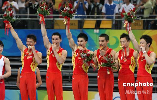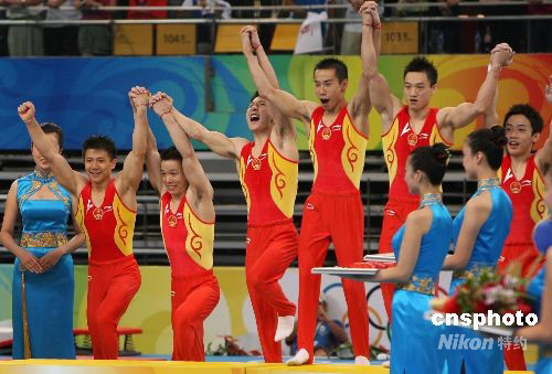 8月12日,在國家體育館舉行的男子體操團體決賽中,中國隊以總分286.125分力壓老對手日本隊,領先第二名7分多的優勢奪得體操男子團體的冠軍,為中國體操隊贏得了開門紅,這是中國代表團在本屆奧運會上的第10枚金牌。 中新社發 武仲林 攝