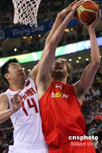 北京奧運會男子籃球小組賽第二輪賽事8月12日打響,首戰負于“夢八隊”的中國男籃在姚明率領下向世錦賽冠軍西班牙隊發起猛攻,上半場結束,中國以46比37領先。圖為王郅治封蓋加索爾的扣籃。中新社發 任晨鳴 攝