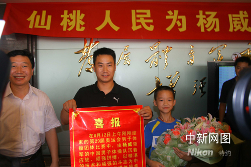 楊威率領(lǐng)中國體操男隊(duì)今日奪得奧運(yùn)會(huì)團(tuán)體金牌。十二日中午時(shí)分,當(dāng)消息傳到楊威的家鄉(xiāng)中國體操之鄉(xiāng)湖北仙桃市,早早守候在電視機(jī)前的當(dāng)?shù)孛癖娨黄序v,人們敲鑼打鼓,鞭炮齊鳴,熱烈慶賀仙桃籍運(yùn)動(dòng)員楊威再次獲得奧運(yùn)會(huì)體操男團(tuán)冠軍。