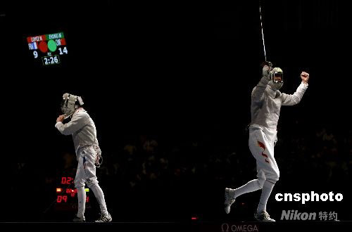 8月12日晚,08北京奧運會男子佩劍個人賽決賽在北京國際會議中心擊劍館揭開戰幕,賽會黑馬14號種子中國選手仲滿和法國選手洛佩茲在決賽中遭遇,結果中國選手仲滿以15-9戰勝對手獲得冠軍,這是中國男子擊劍在奧運會上第一次獲得冠軍。 中新社發 盛佳鵬 攝