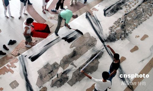 圖為蔡國強在爆破前以掃走為筆進行最后繪制。 中新社發 傅丹丹 攝
