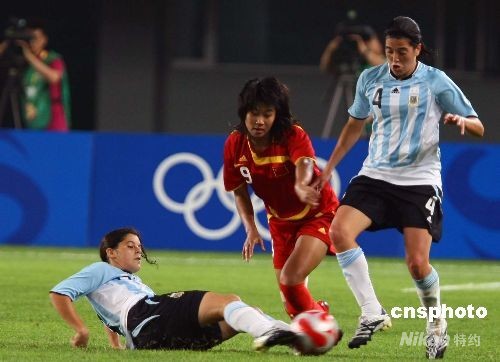 8月12日晚,奧運(yùn)女足小組賽第三輪賽事展開,中國女足對陣阿根廷隊(duì)。第50分鐘,中國隊(duì)右路起球,阿根廷門將出擊失誤沒摘到球,韓端與對方防守球員碰撞中把球打進(jìn)了球門。中新社發(fā) 劉新 攝
