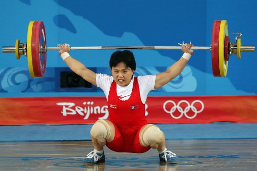 8月12日,朝鮮選手樸賢淑在北京奧運(yùn)會(huì)女子舉重63公斤級(jí)比賽中。