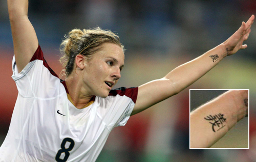 參加北京奧運會的許多外國運動員選擇用漢字紋身,圖為美國女足運動員艾米·羅德里格斯12日在沈陽分賽場的比賽中慶祝進球,展現漢字“義”的紋身。中新社記者 張宇攝