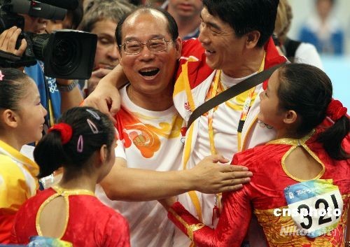 8月13日,北京奧運會女子體操團體決賽在北京奧林匹克公園內(nèi)的國家體育館舉行,由程菲、何可欣、江鈺源、李珊珊、楊伊琳、鄧琳琳組成的中國體操女隊創(chuàng)造歷史,以總成績188.900分摘取桂冠,奪得中國體操歷史上第一枚奧運會女子團體金牌。圖為掛上金牌的小姑娘們與中國體操管理中心主任高健及全體教練合影。中新社發(fā) 任晨鳴 攝