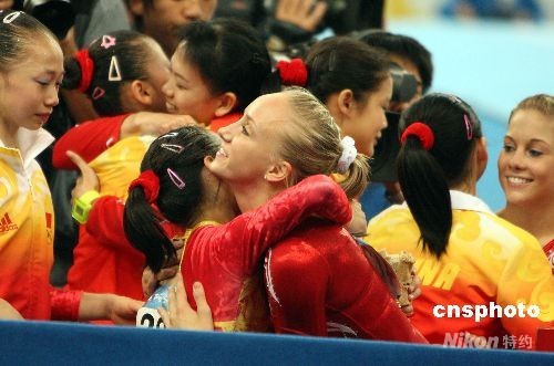 美國隊祝賀中國女子體操隊奧運奪冠。中新社發 任晨鳴 攝