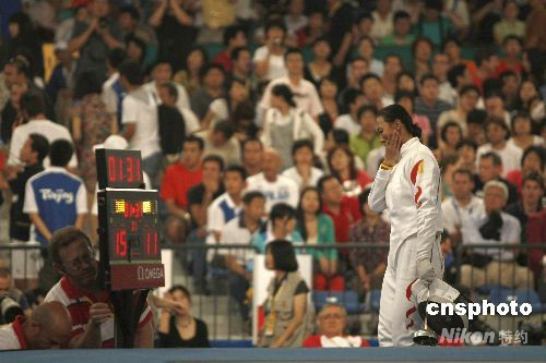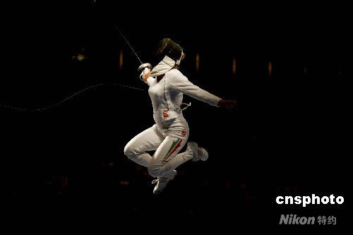 8月13日晚,在北京奧運會女子重劍個人賽銅牌爭奪戰中,賽會第4號種子中國選手李娜(右)在比賽中以11-15不敵第11號種子匈牙利選手伊爾迪科,獲得女子重劍個人賽的第4名。 中新社發 盛佳鵬 攝