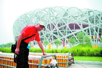 鐘自奇在鳥巢附近檢查焰火產品。鐘勇攝
